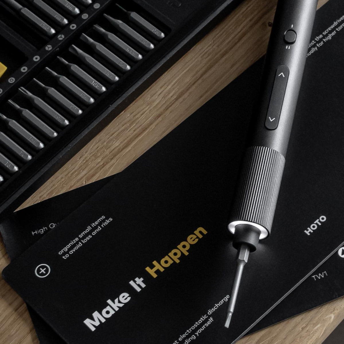 Dual-torque level for precise adjustments in various repairs. One-press switch, LED shadowless light, magnetic bit installation, inbox charging, and anti-slip aluminum case.